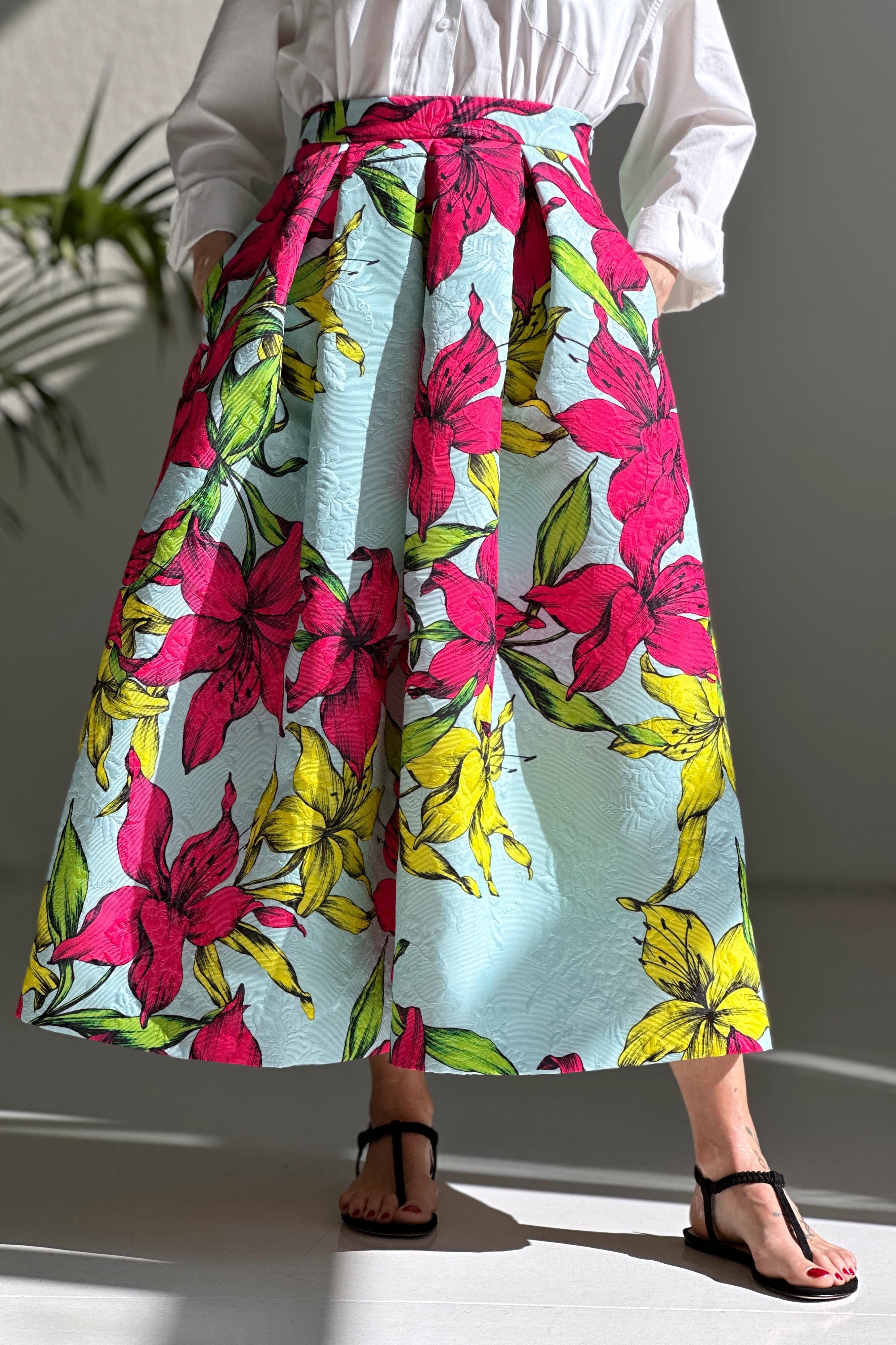 Gonna midi ampia a vita alta confezionata in tessuto jacquard stampato
