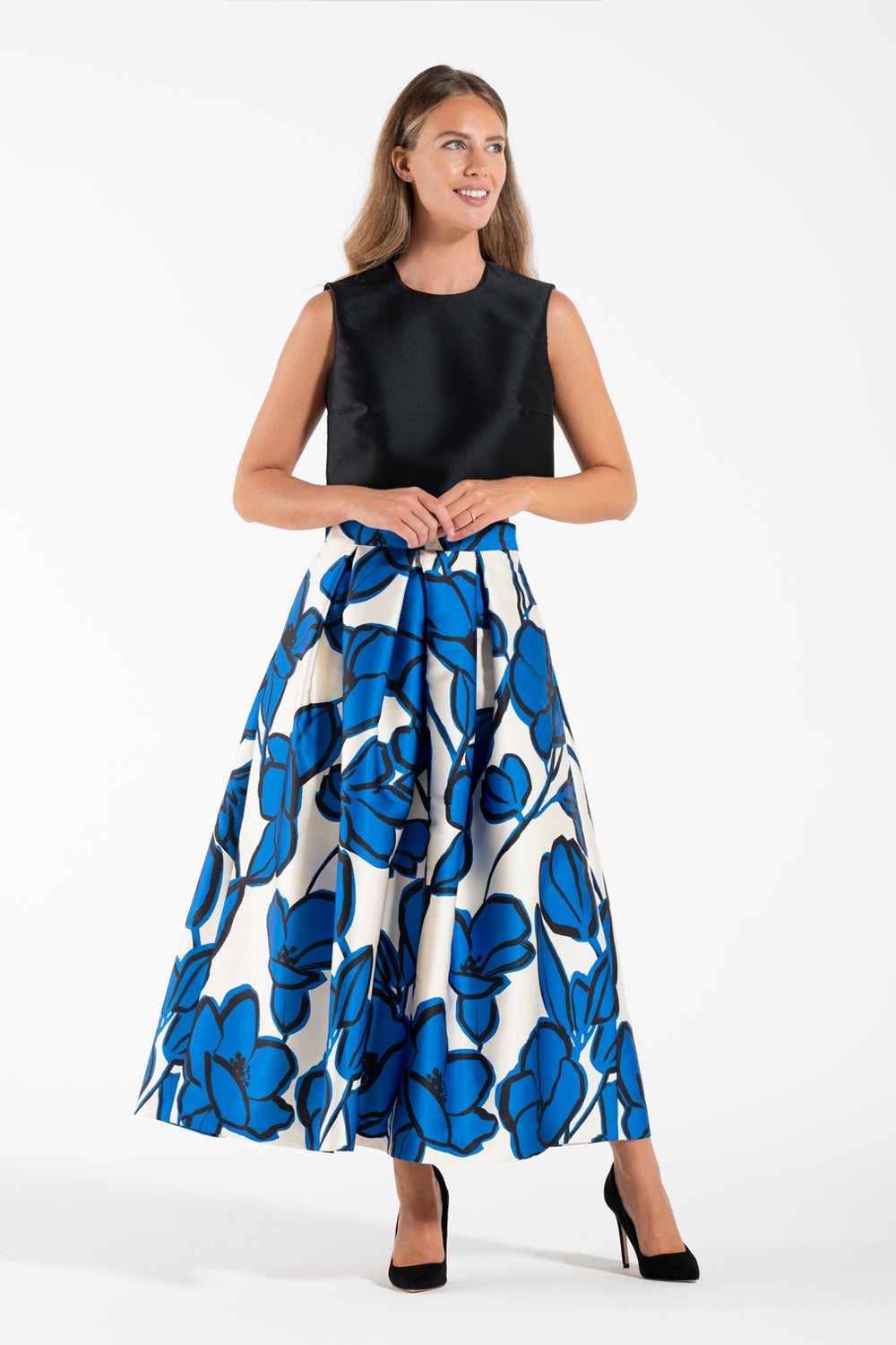 Gonna Luna K midi skirt with high waist, blue floral print, invisible zipper, and pockets.