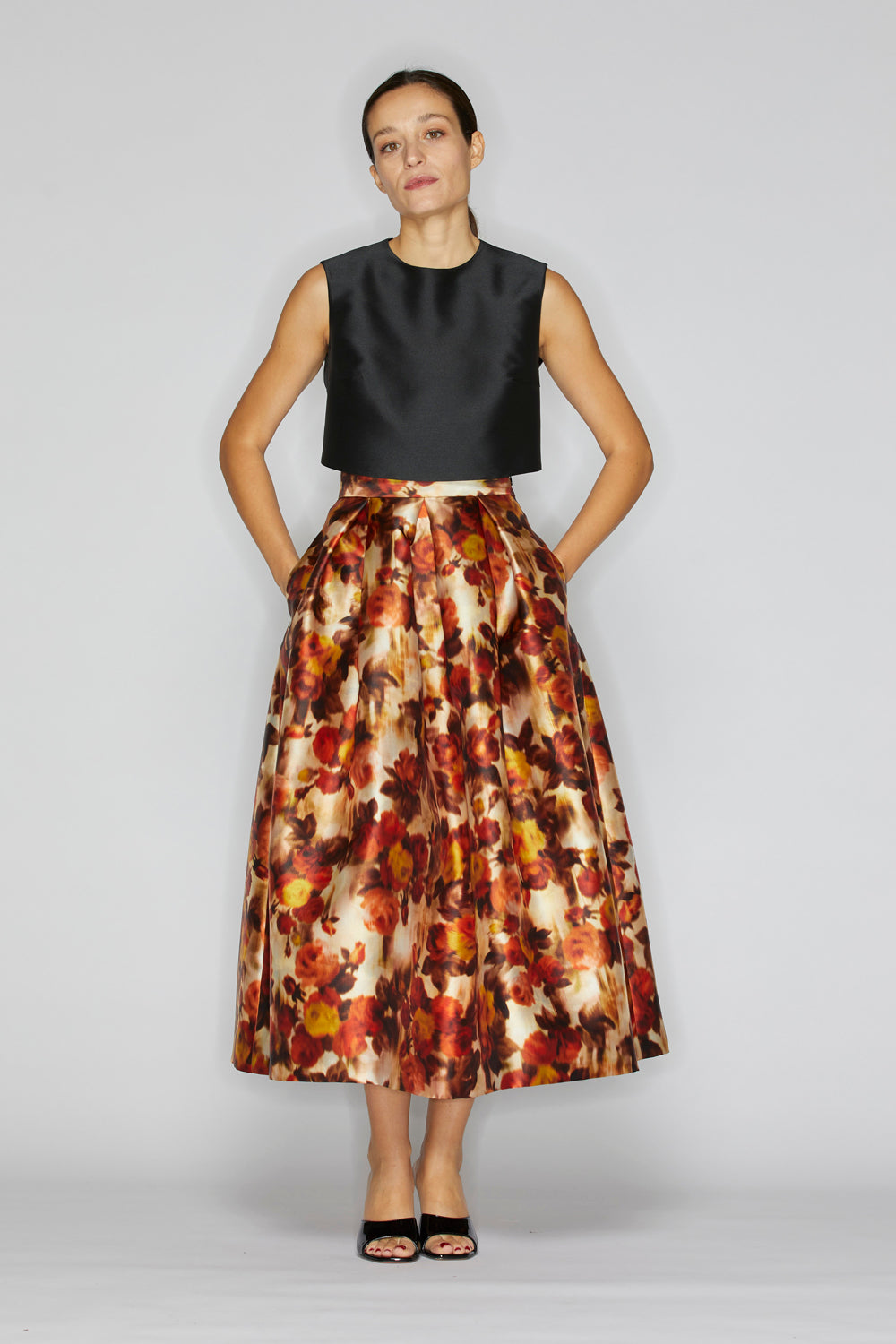 Wide, high-waisted midi skirt made of printed mikado fabric